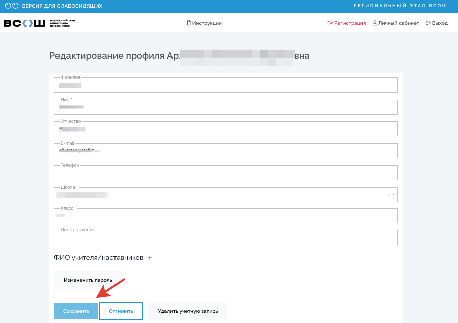 Проверьте правильность полученных данных из РГИС (ФИО, класс, школа и т.д.). При необходимости - исправьте и сохраните профиль.