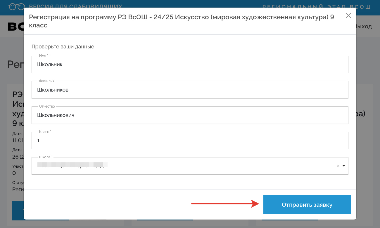 2. Под фотографией кнопка "Регистрация на Школьный этап"