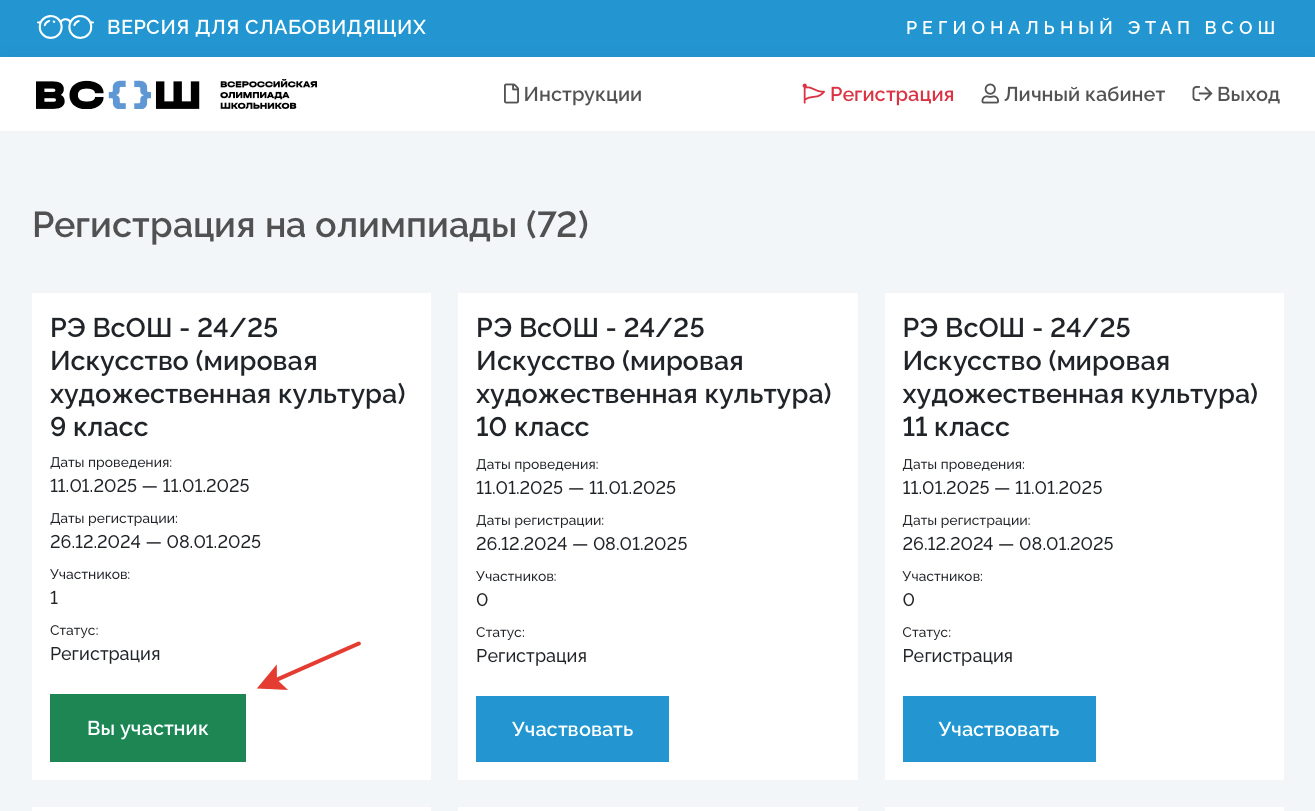 После успешного входа в личный кабинет вы попадете в раздел "Регистрация на олимпиады".