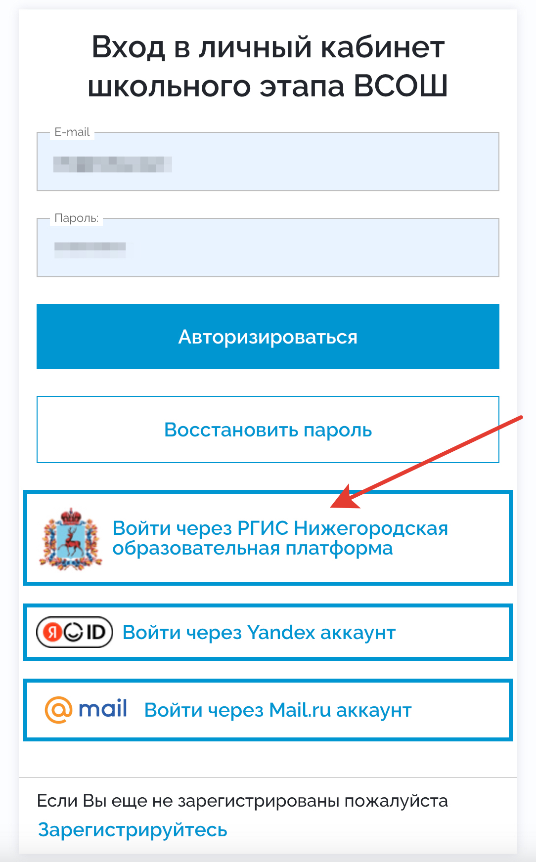 Если вы впервые на платформе ВсОШ, зарегистрируйтесь по соответвующей кнопке. Или используйте сервисы входа РГИС, Яндекс и Майл.ру.