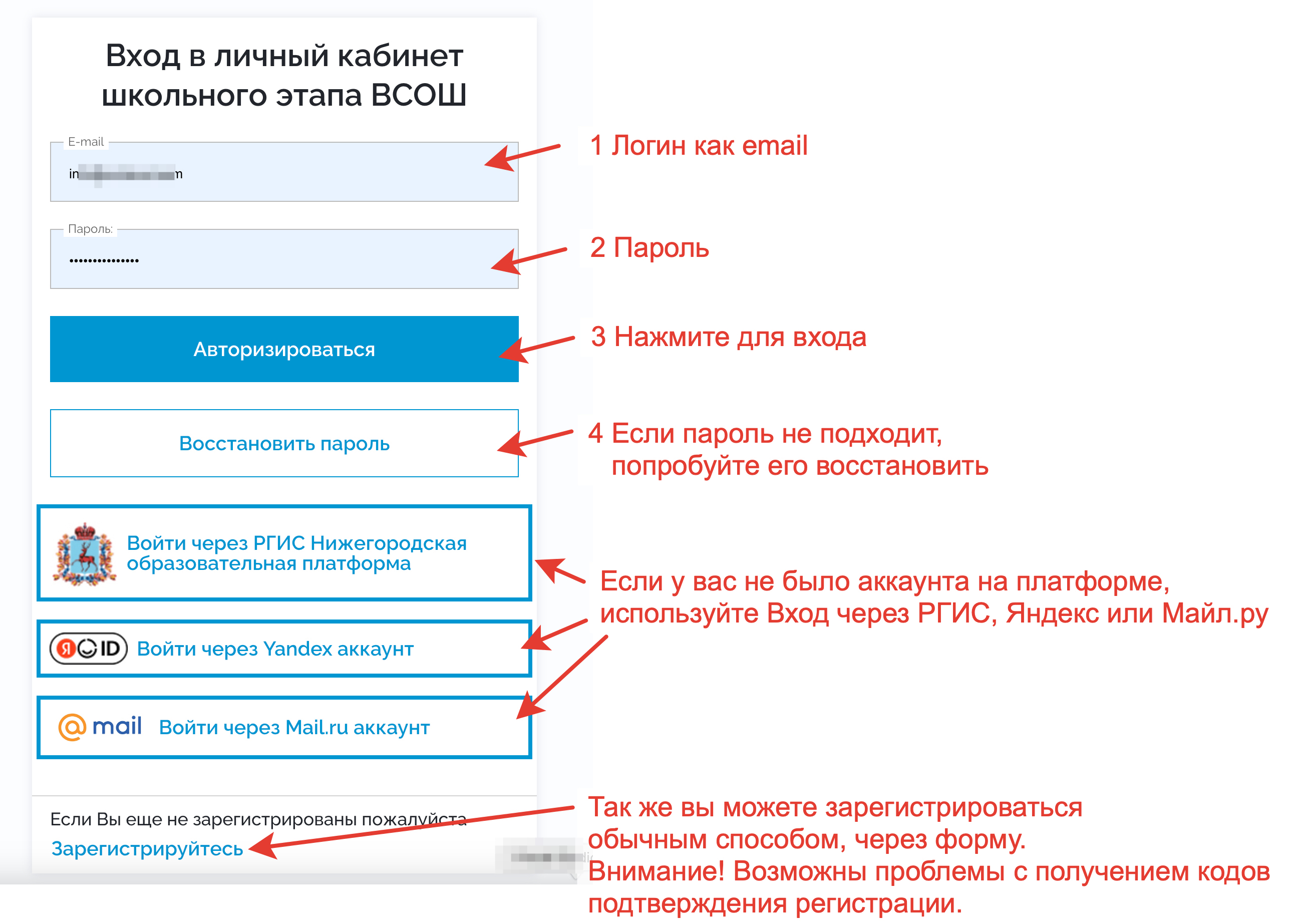 Если вы ранее участвовали в олимпиадах на платформе ВСОШ, введите ваш email и пароль. Если пароль не подходит, воспользуйтесь кнопкой "Восстановить пароль"