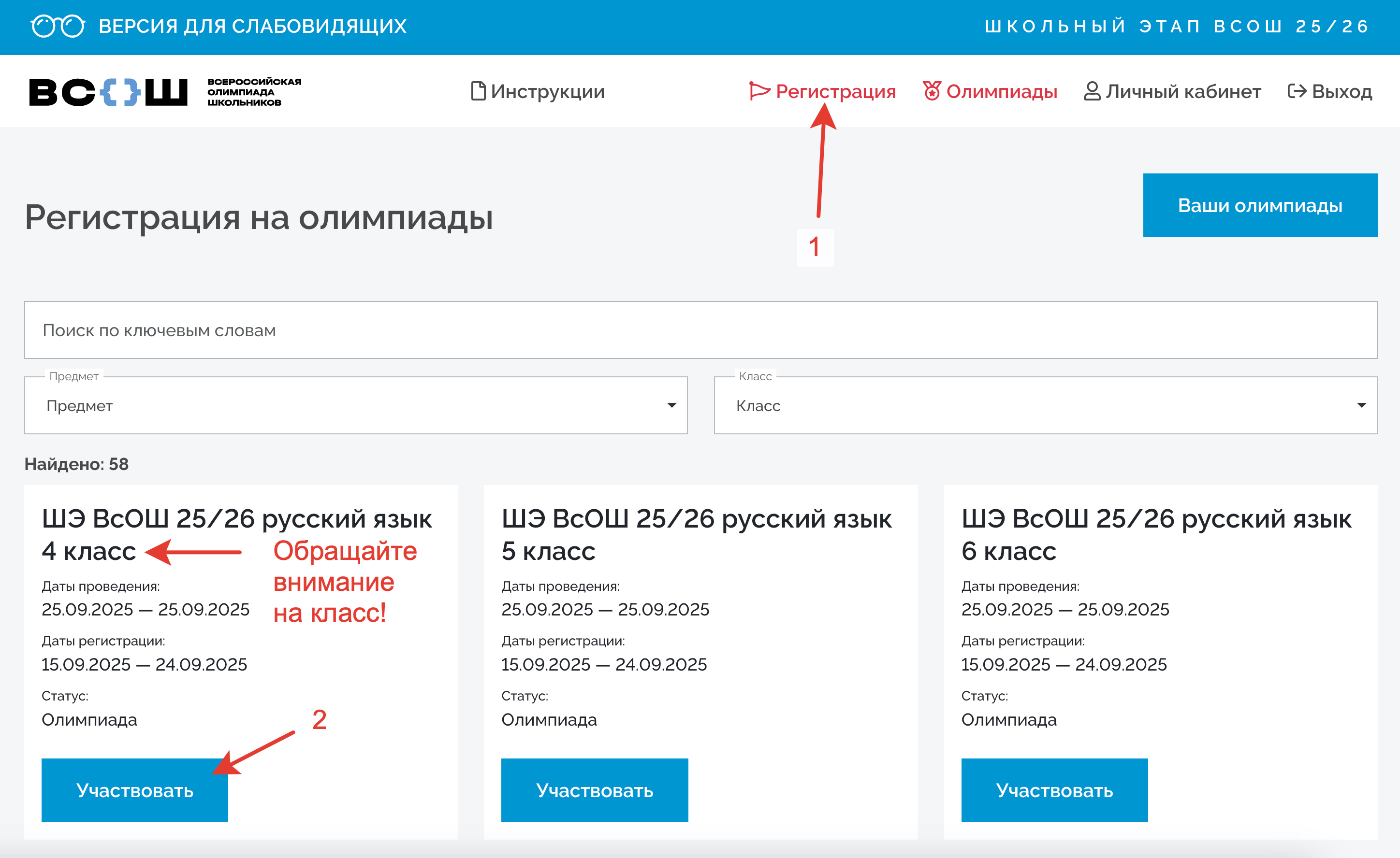 Выбирайте жалемый предмет и класс - нажимайте "Участвовать".