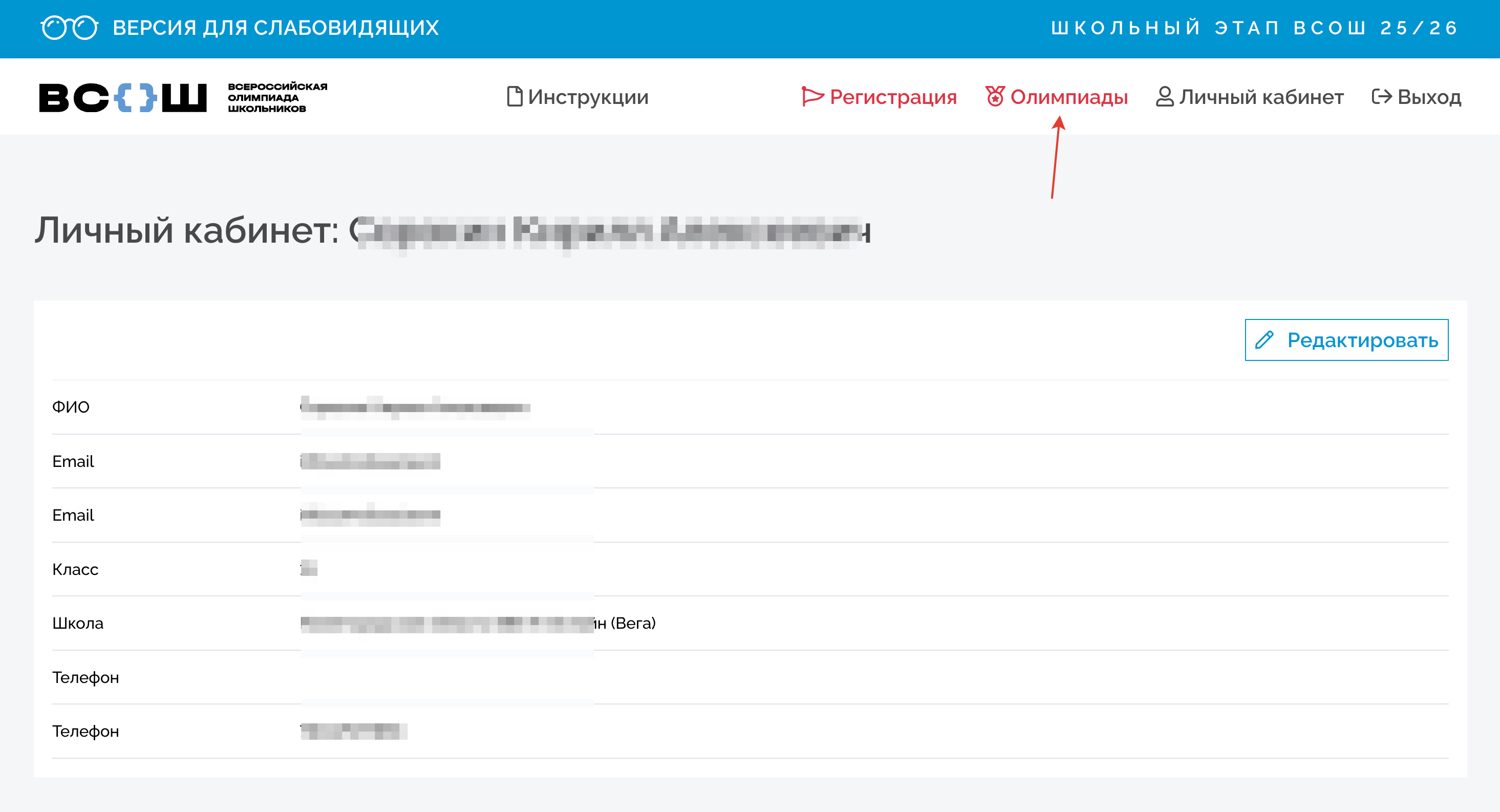 В назначенный день, войдите в свой личный кабинет и нажмите в меню Олимпиады.